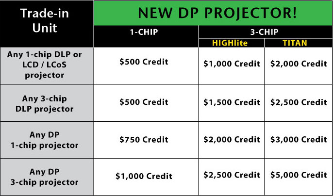 Back to Top  Digital Projection Launches Home Cinema Trade Up Program Digital Projection is offering $500, $750 and $1,000 credits towards trading in an old projector (and in many cases, it doesn't matter if it's an old DPI projector or any third-party brand) and buying a new one. |