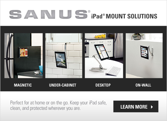 Back to Top  SANUS Readies iPad Mounts to Ship SANUS' new line of iPad Mounts and iPad mini Mounts will be shipping in the next two weeks. With SANUS iPad Mounts, you can take your tablet from your hand to your desk, the wall, under a cabinet or to any magnetic surface.
