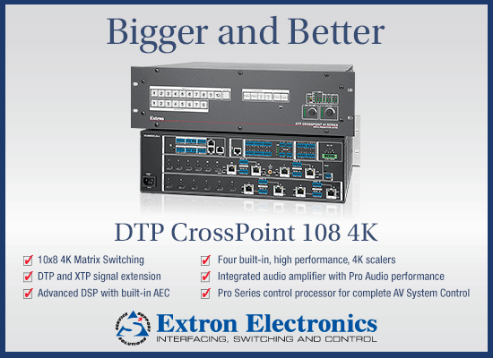 Extron has launched a new DTP CrossPoint 108 4K presentation matrix switcher. The DTP CrossPoint 108 4K includes a 10×8 matrix switcher with 4K inputs and outputs, four built-in 4K scalers (powered by Extron Vector 4K scaling technology) seamless switching and logo insertion, integrated DTP and XTP signal extension, audio DSP and AEC capabilities, a mono or stereo amplifier and an advanced control processor that is expandable.