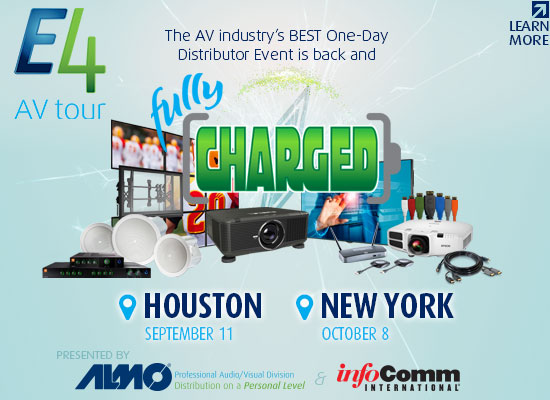 Almo Professional A/V announced it is taking its “Fully Charged” E4 AV Tour to Houston for the first time on September 11 and to the New York Metro area on October 8. In addition to the same refreshing training, electrifying new products and powerful networking opportunities that bring local resellers, integrators and consultants to the E4 events, the fall tour is launching two new hands-on “E4 Experience” workshops focusing on Digital Signage Content & Distribution and BYOD & Collaboration. Almo’s high-demand HDBaseT Installer Expert Certification training is also making a return this fall.