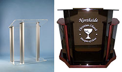 AmpliVox’s Acrylic Lecterns are more contemporary in style, with each lectern manufactured from thick plexiglass sheets in either clear or smoked finishes, in a wide range of styles. They ship fully assembled and ready to use. Customized front panels are available in most models of lecterns, which also feature a range of wood and metal accent choices. The logo complements the lectern’s materials while still allowing a clear view of the speaker.