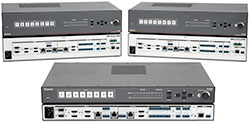 Back to Top  Extron Introduces New Eight-Input Scaling Presentation Switchers with DTP Extension Extron's new IN1608 is an eight-input, HDCP-compliant scaling presentation switcher with four HDMI inputs, two universal analog video inputs and dual HDMI outputs. It also features two Extron DTP 230 twisted pair inputs and a DTP 230 output for extending HDMI, audio and bidirectional control signals to DTP 230 transmitters and receivers, each over a single CATx cable up to 230 feet (70 meters). The IN1608 provides the convenience of supporting local and remote displays with fast and reliable switching, and a high performance scaling engine that converts all HDMI and analog sources to the optimal resolution. Selectable output resolutions are available up to 1920×1200, including 1080p and 2K. The IN1608 also includes a host of audio switching and processing features. It is available as a standard model with two stereo audio outputs, the IN1608 SA, which adds a stereo 4/8 ohm power amplifier and the IN1608 MA with a mono 70 volt amplifier.