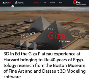DisplayDaily The use of 3D in Education or 3D in Ed is having a dramatic impact on displaying some very old data and offering new perspectives and insights in the process. Researchers at Harvard, including Egyptologist Dr. Peter der Manuelian, the Department of Earth and Planetary Sciences’ Visualization Facility, and the Boston Museum of Fine Art are getting some help from 3D Modeling Software pioneer Dassault Systems (Boston, Mass.) in a “world’s first attempt…” They now have a complete map, plan and model, of the famous Giza Plateau according to Harvard’s Professor Der Manuelian. His Giza Plateau 3D model was developed in collaboration with Dassault (3D modeling software)