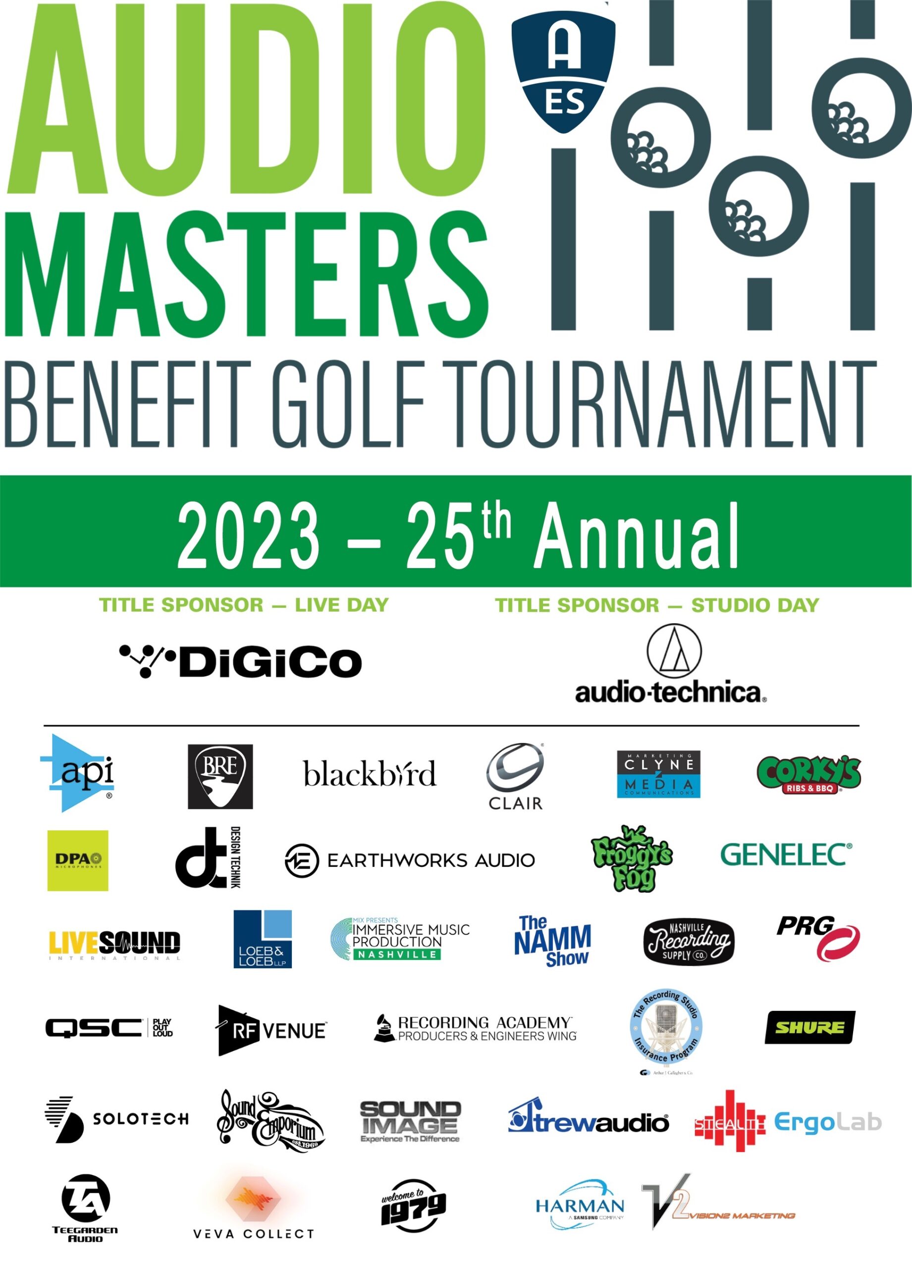 The growing list of additional sponsors include returning supporters API, the Audio Engineering Society, Black River Entertainment, Blackbird Studios, Clair Global, Clyne Media, Corky’s Ribs and BBQ of Brentwood, DPA Microphones, Design Technik, Earthworks Audio, ErgoLab/Stealth Chairs, Froggy’s Fog, Genelec, Live Sound International, Loeb & Loeb, Mix Magazine, The NAMM Show, Nashville Recording Supply, RF Venue, The Recording Academy® Producers and Engineers Wing®, The Recording Studio Insurance Program, Shure, Solotech, Sound Emporium, Sound Image, Trew Audio, Teegarden Audio, VEVA Collect, Vision 2 Marketing (HARMAN), and Welcome to 1979 Studios, with new sponsors Carl Tatz Design, PRG (Production Resource Group) and QSC also supporting the Nashville audio community and feting players around the course. Limited additional sponsorship opportunities are still available here.