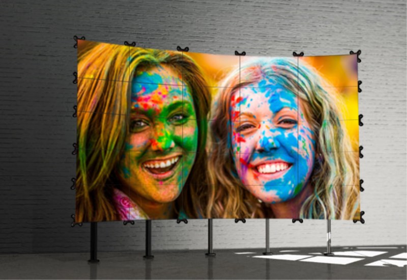 The complete solution is based on a solid back structure offered by Vogel’s in combination with curved crosses and special corner pieces that are part of the UniSee Curved accessory kit. This solution is available in landscape and portrait modes, as a floor-to-wall mounting structure.