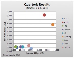 To interpret this chart correctly keep in mind that 0 percent growth on either axes represent the same result as last year. If the company had a loss in last year’s quarter, 0 percent means they still have the same loss this year. Progress means you want to be in the top right quadrant. As we can see, all companies besides HTC are in the upper half of the chart, meaning their profitability has improved in the last quarter. Beside Apple and Samsung, Lenovo also manged to improve not only profitability but also sales.