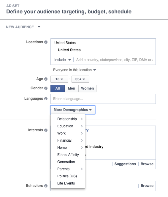You’ll notice that by just using some basic settings, I’ve defined an audience that is broad and will cost more money. To narrow down the scope, I’ll need to add some more characteristics about my audience. The United States is a huge location to cover, as well as the age range of 18-65+.