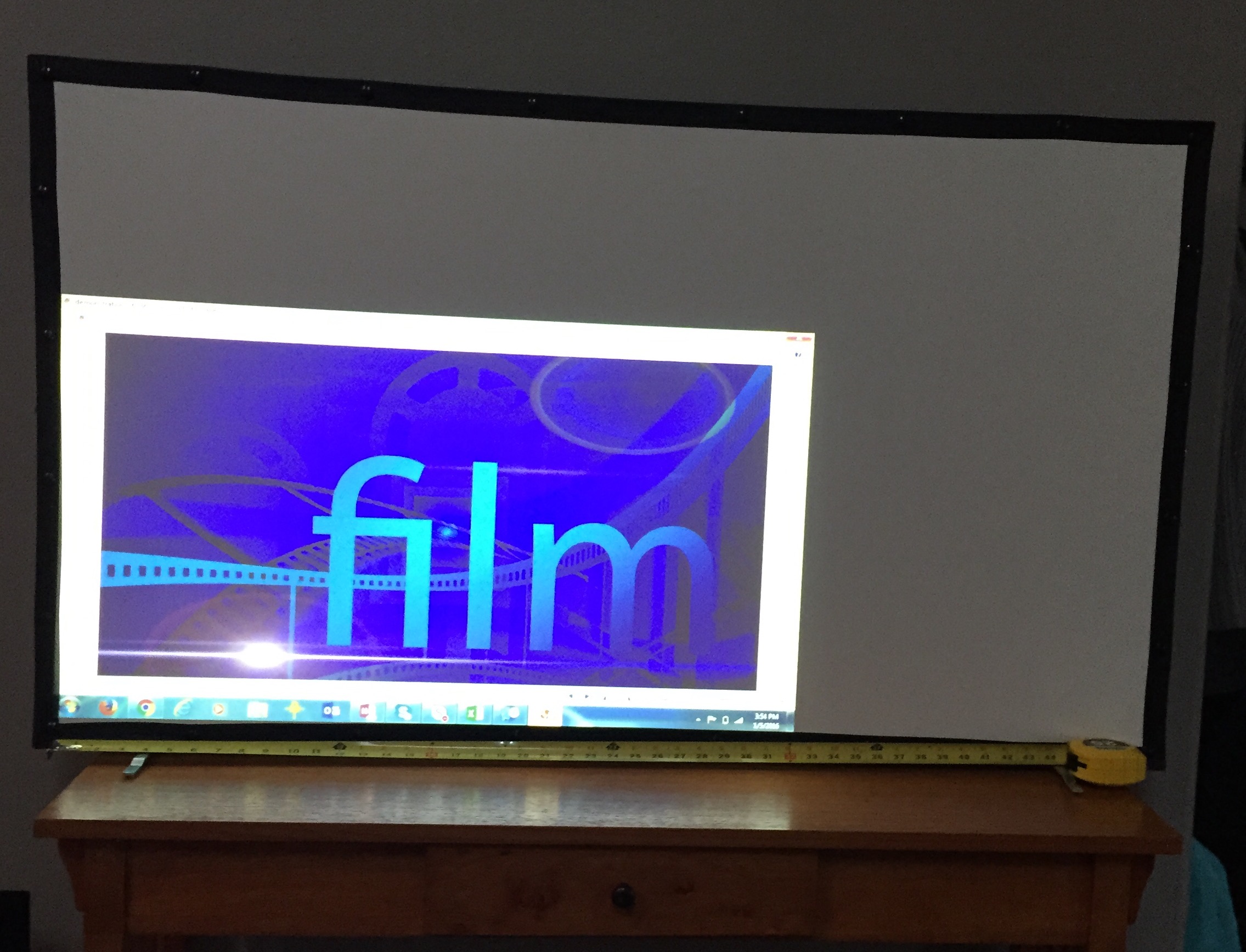 Now the 55″ 16:9 screen is effectively 9 square feet. So when I fill the screen as you see above, it represents 33 lumens per square foot. As you can see from the two images below,with a couple windows open and the lights on, it is fairly washed out.