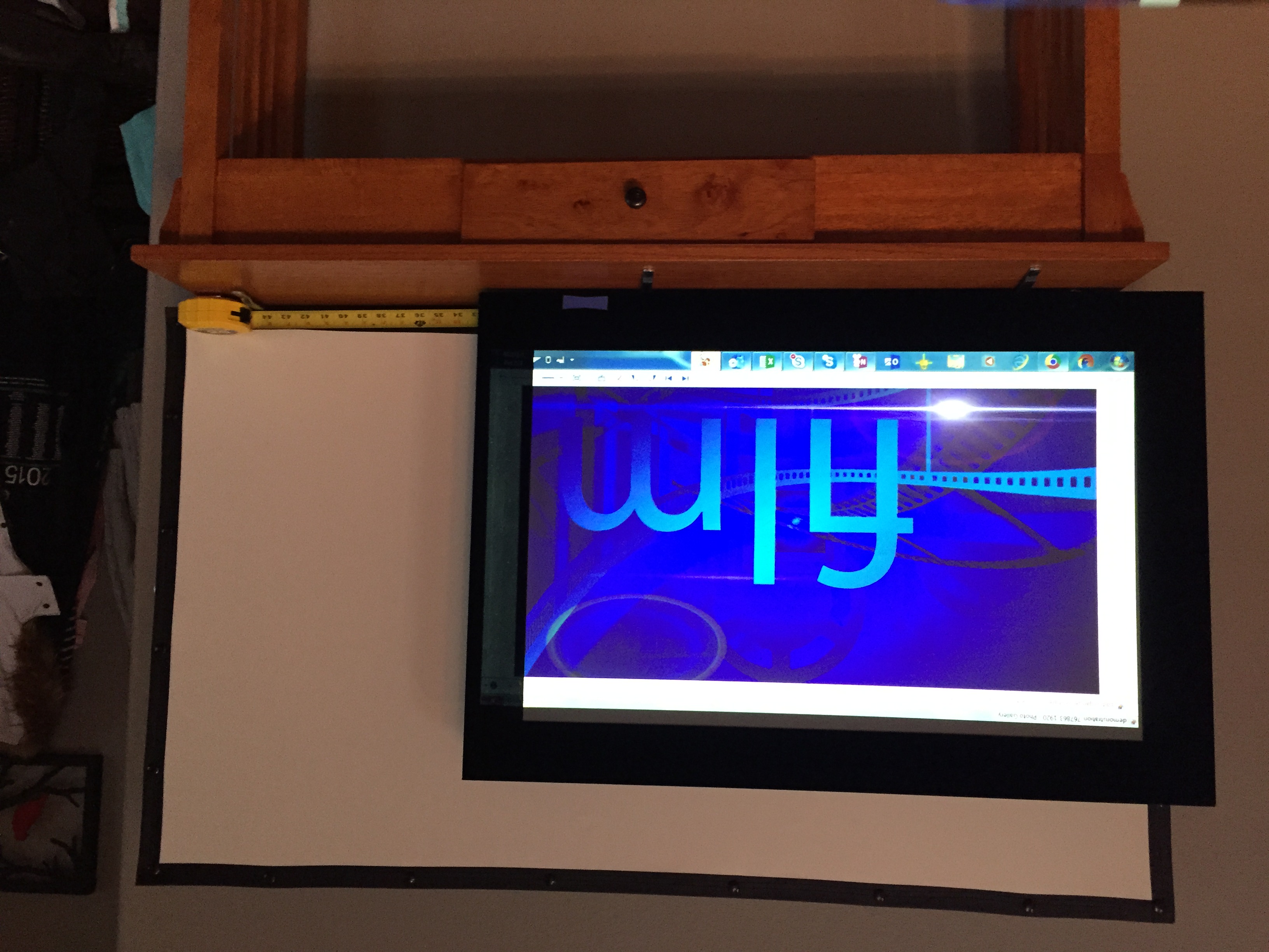 I go to my screen, and layout my tape to show where 41.6 inches is. Then I move my projector setup forward toward the screen until the new image is 41.6″ wide. Given the aspect ratio of the projector is locked, I don’t need to measure height. My new image reflects 44 lumens per foot.