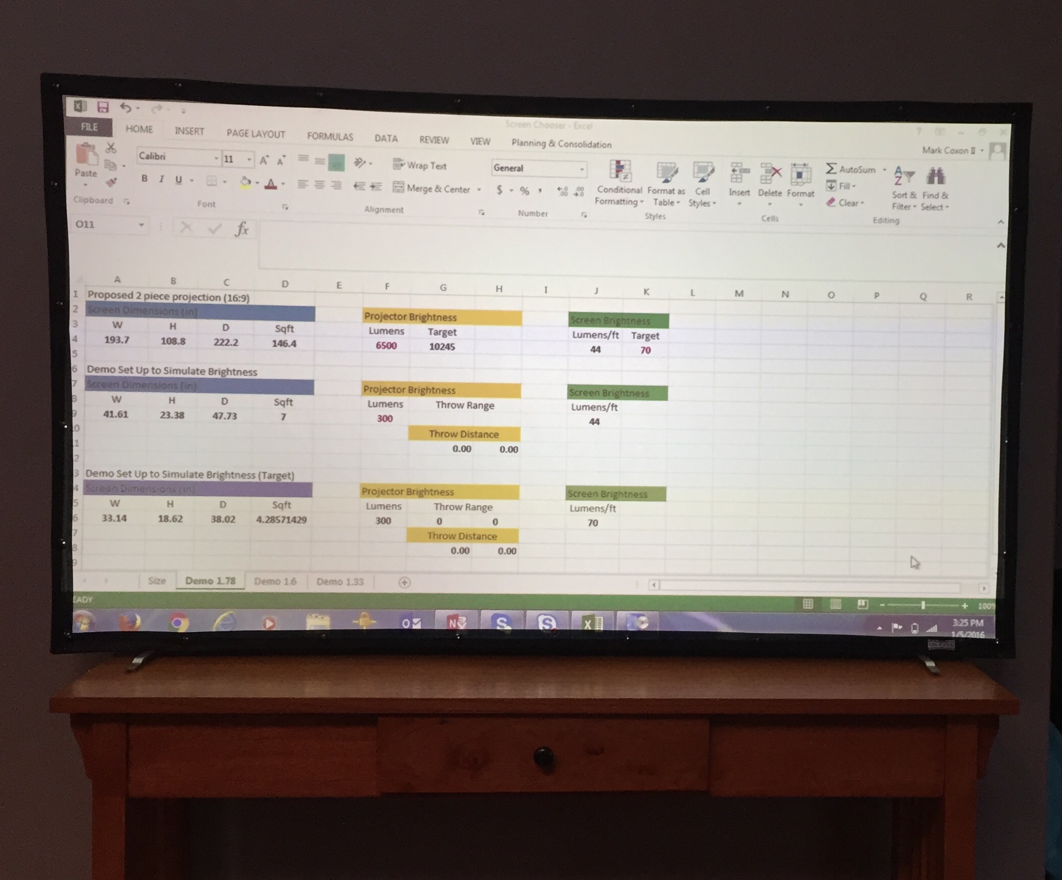 It’s time to demonstrate how bright a 6500 lumen projector would be in this space using this same 300 lumen projector. Here is where my handy dandy excel calculator comes in.